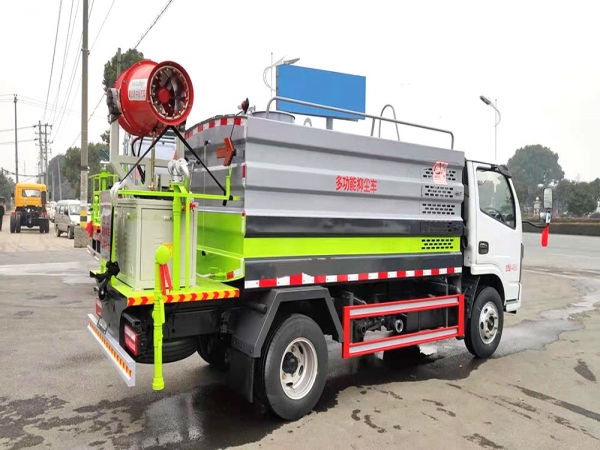 【性能簡介】多功能抑塵車主要用于城市空氣凈化、園林農藥噴灑、抑塵降霾、防疫消殺消毒、公路或竟賽場地的養護、保濕、降溫。可配置30米遠程噴霧機,配套動力功率8.5Kw,風機功率3Kw,水泵功率2.2Kw,風機噴頭數量16個,風機水平射程≥30m,風力強勁,水霧均勻,霧炮可全方位360°旋轉。