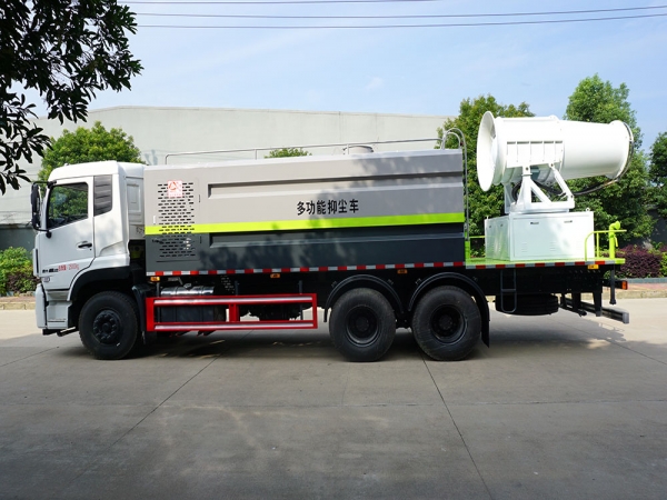 【性能簡介】多功能抑塵車主要用于城市空氣凈化、園林農藥噴灑、抑塵降霾、防疫消殺消毒、公路或竟賽場地的養護、保濕、降溫。可配置30米遠程噴霧機,配套動力功率8.5Kw,風機功率3Kw,水泵功率2.2Kw,風機噴頭數量16個,風機水平射程≥30m,風力強勁,水霧均勻,霧炮可全方位360°旋轉。