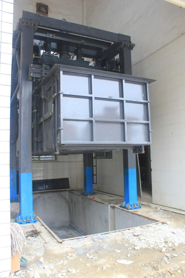 垃圾箱體是垂直式垃圾壓縮站的主體。它將各個系統和機構有機的連接起來,完成垃圾的收集、壓縮。垃圾箱體的頂部設有投料口,主要用于垃圾的收集;垃圾箱體插銷孔座,通過壓頭的四個液壓插銷將壓頭與垃圾箱體連接在一起,并通過壓縮油缸實現上升和下降;垃圾箱兩側各設置有4組導向滑塊,確保垃圾箱上升和下降平穩;同時垃圾箱體中段與推鏟機構、閘門機構共同組成了一個密閉的空腔,以實現垃圾的垂直壓縮;壓縮完的垃圾塊儲存在垃圾箱體的出料口端,一次可儲存2塊垃圾塊。