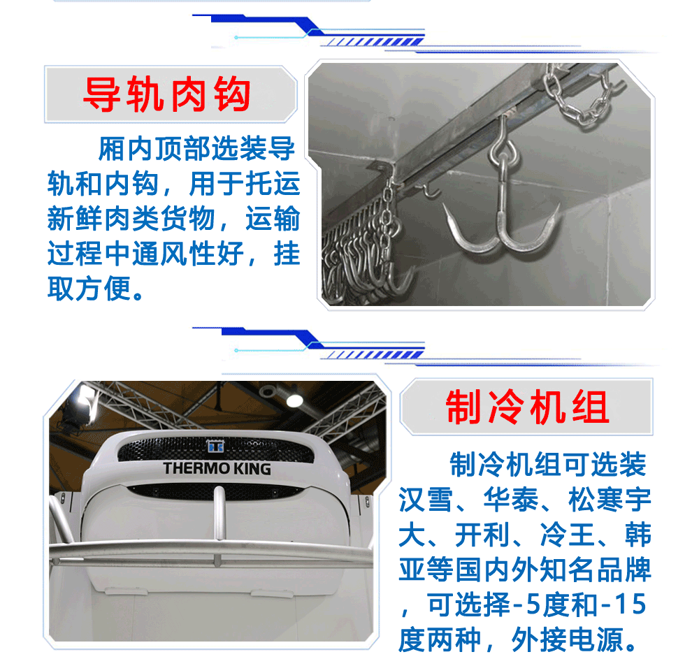 5、導(dǎo)軌肉鉤,運(yùn)輸肉類等貨物時(shí),方便將其掛起。6:不銹鋼貨架:用于盛放食品等專用。